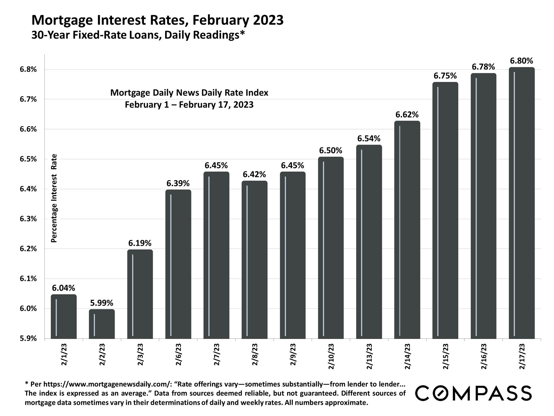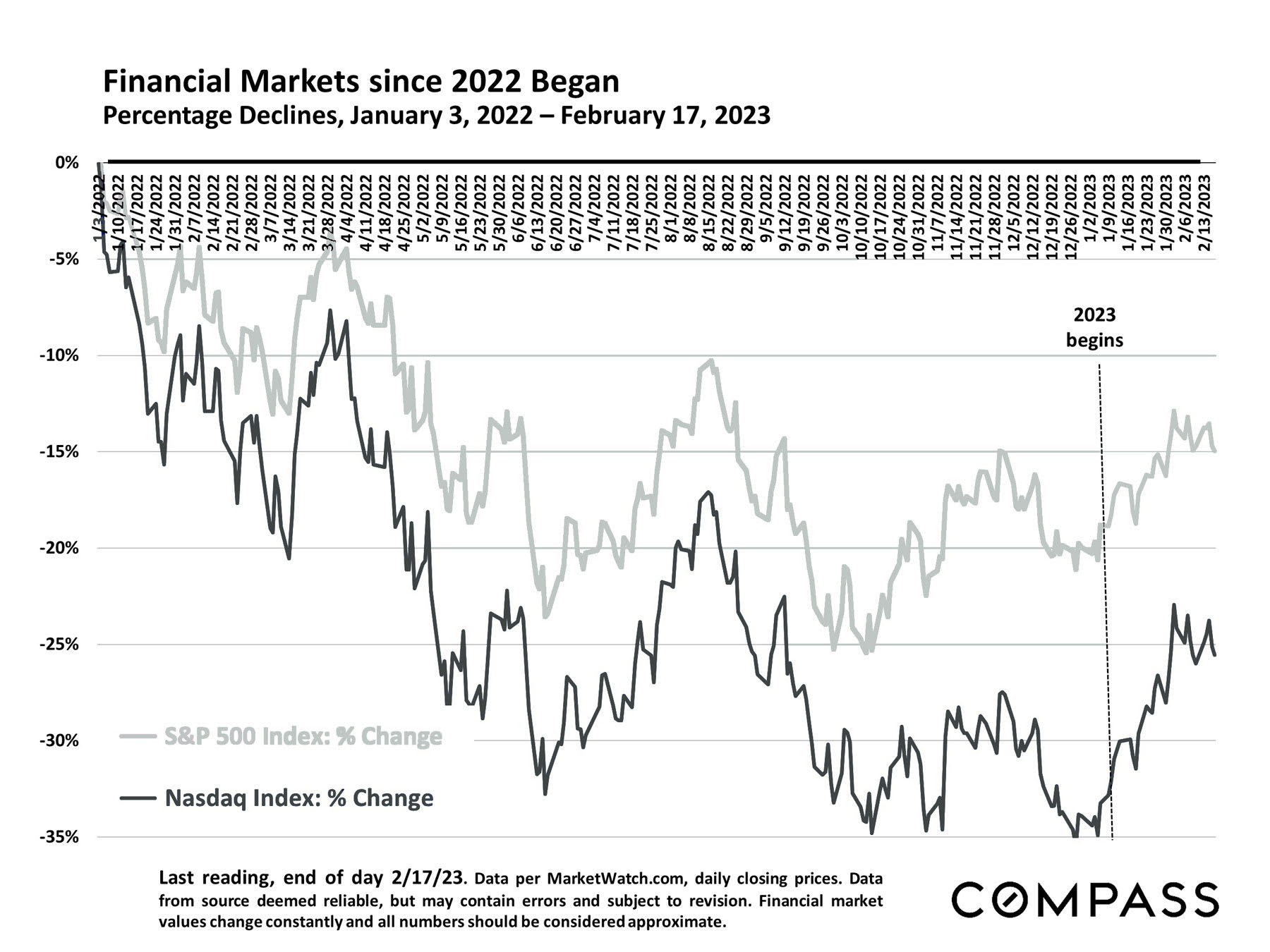 With some volatility, stock markets have fallen in February, but remain well above where they started this year, especially the Nasdaq. Affluent buyers generally seem to be affected more by financial markets than by interest rates, though of course, economic factors are often intertwined.