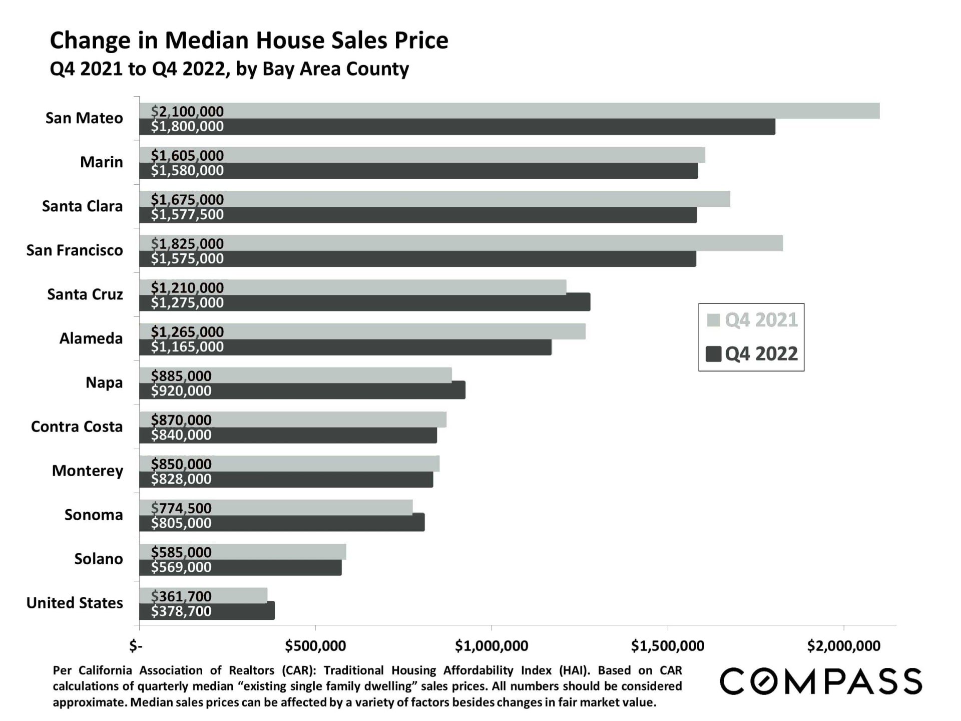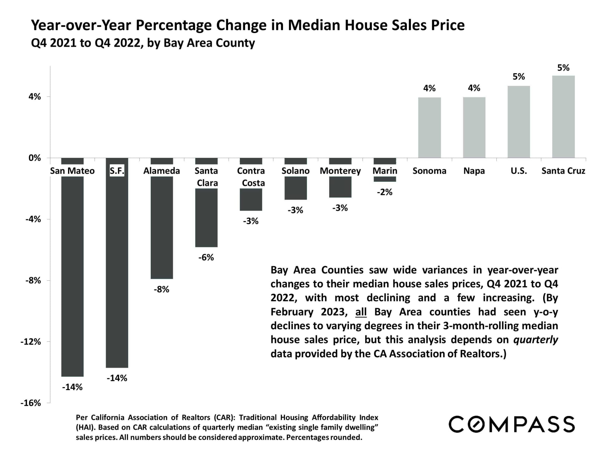 Nearby Counties with positive median sales price growth from Q4 2021 to Q4 2022 were Napa and Sonoma Counties. Contra Costa and Marin are the closest counties to San Francisco where pricing was less negatively impacted.
